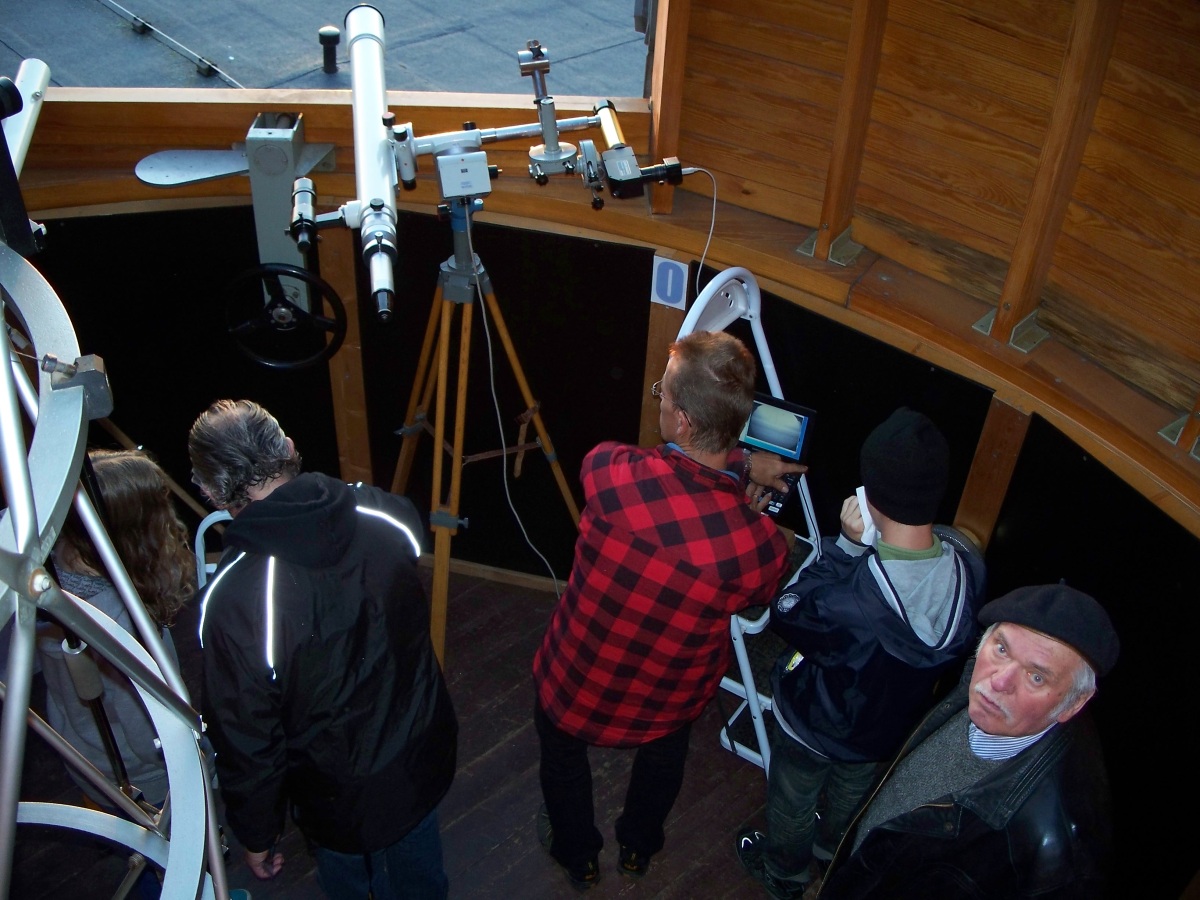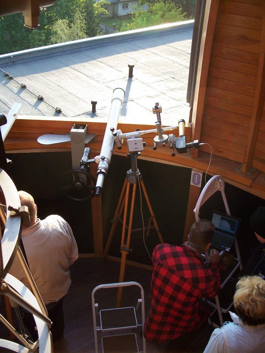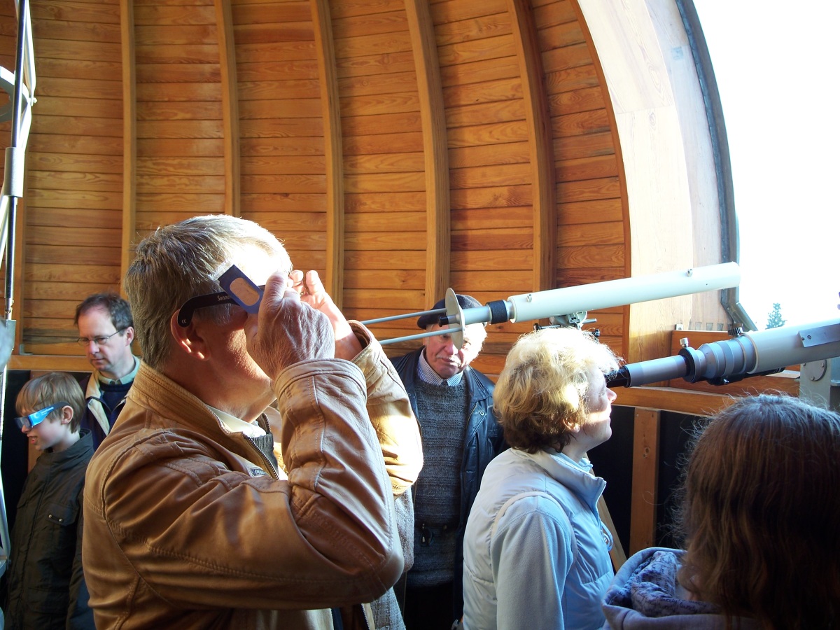 Am 6. Juni 2012 gab es am Morgenhimmel ein ganz besonderes Ereignis, welches erst in 105 Jahren wieder zu beobachten sein wird. Gemeint ist der Venustransit. Das gesamte Schauspiel begann um 00:09 MESZ und dauerte ca. 6 Stunden und 40 Minuten. Da in Dahlewitz der Sonnenaufgang erst ca. 05:00 Uhr MESZ war, konnten von dort aus nur die letzten 90 Minuten beobachtet werden. Fünfzehn Besucher haben trotz der frühen Stunde den Weg zur Sternwarte Dahlewitz gefunden und wurden dank des wolkenfreien Himmels mit einem besonderen Erlebnis belohnt. Deutlich war das kreisrunde Venusscheibchen zu sehen, wie es sich langsam über die Sonnenscheibe bewegte. Da sich die Sonne in einer Phase hoher Sonnenaktivität befindet, waren neben der Venus auch zahlreiche Sonnenflecken zu sehen.