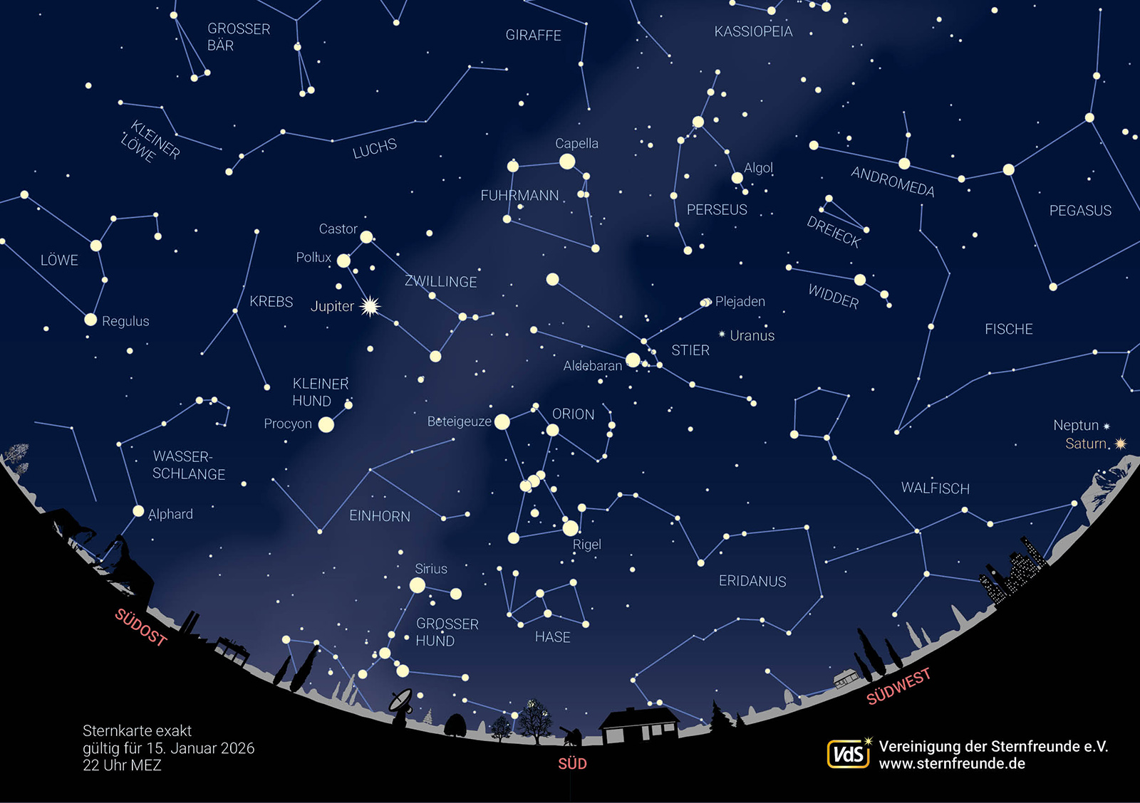 Hund), dann Procyon (im Kleinen Hund), Castor (in den Zwillingen), Capella (im Fuhrmann), und schließlich Aldebaran im Stier. Die Wintermilchstraße zieht durch die Sternbilder Großer Hund, Einhorn, Zwillinge, Stier, Fuhrmann, Perseus und Kassiopeia. Sie ist nicht so hell wie im Sommer, da wir von der Erde aus derzeit zum Rand unserer Galaxis hin blicken. Saturn und Neptun gehen im Westen unter. Uranus hält sich hoch oben im Stier auf. In den Zwillingen zieht der helle Jupiter die Blicke auf sich.