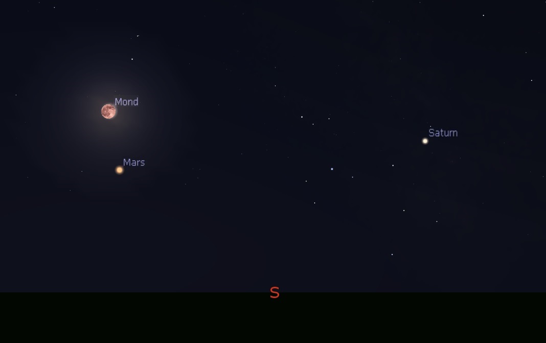 Das Himmelsspektakel wurde begleitet von der Opposition des Mars, das heißt, der Mars stand von der Erde aus gesehen genau gegenüber der Sonne und war der Erde somit besonders nahe. Auch der Saturn ließ sich in dieser Nacht sehr gut beobachten. Ein weiteres Highlight waren 2 Überflüge der ISS, von 22:32 Uhr bis 22:39 Uhr und am 28.07. von 00:08 Uhr bis 00:12 Uhr. Die folgende Grafik zeigt den Südhimmel am 27.07. gegen 22:00 Uhr MESZ: