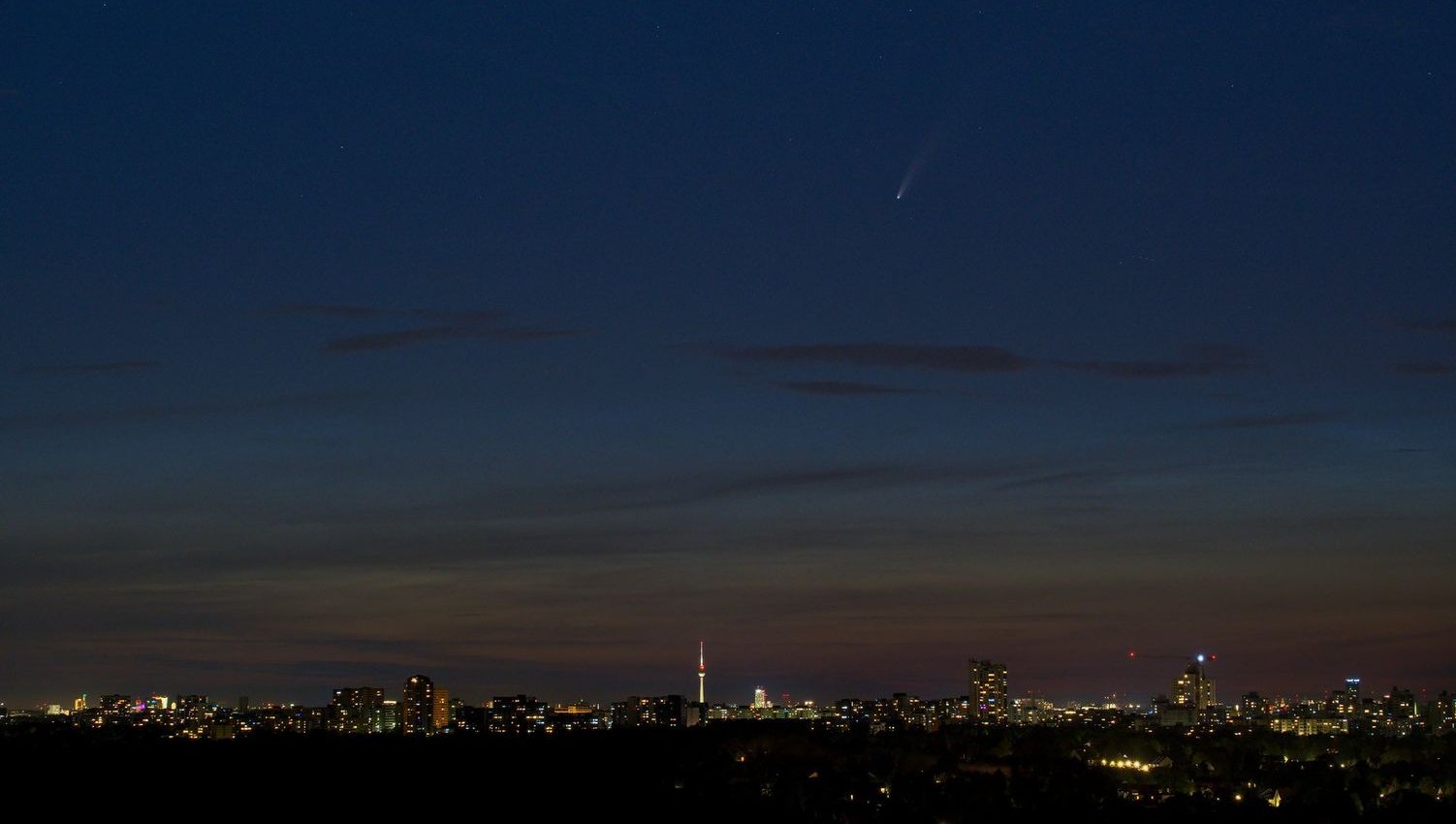 Der Komet Neowise (C/2020 F3) war bis weit in den Juli 2020 mit bloßem Auge sichtbar. Sehr lohnend war der Anblick bereits mit einem einfachen Feldstecher. Nachdem sich der Komet in unserer Region bis Anfang Juli nur in den frühen Morgenstunden gezeigt hat, konnte er bis Ende Juli von Sonnenuntergang bis kurz vor Sonnenaufgang in Richtung Nordwest bis Nordost beobachtet werden. Neowise ist ein ca. 5 km großer vorwiegend aus Eis bestehender Brocken, der in Sonnennähe allmählich verdampft und so den charakteristischen Kometenschweif bildet. Das nächste Mal wird er in etwa 6800 Jahren in Erdnähe sein.