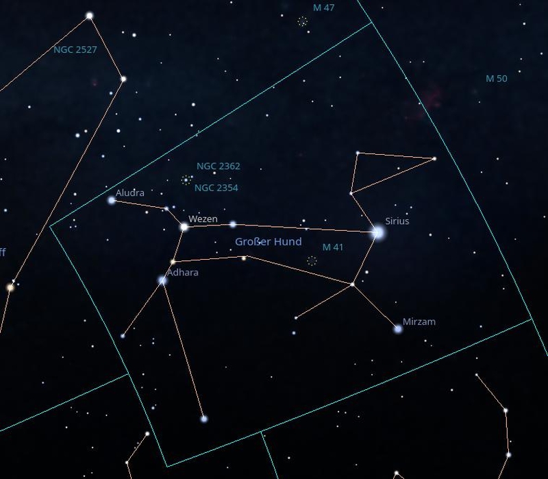 ![]() ![]() ![]() ![]() ![]() ![]() ![]() ![]() ![]() ![]() ![]() ( Canis Maior, CMa )![]() Der wilde und gewaltige Jäger Orion aus Boitien hatte bei all seiner Wildheit ein gutes Herz. Als er eines Tages mit seinen beiden Hunden, einem großen und einem kleinen, auf der Jagd war, hetzte der große Hund einen Hasen. Dieser legte sich zu den Füßen des Orion nieder und fand bei diesem Schutz. Mit einer riesigen Streitkeule bewaffnet verfolgte Orion eines Tages die sieben Töchter des Atlas und der Pleione, die Plejaden. Ein wütender Stier stellte sich ihm in den Weg. Orion trat dem Stier furchtlos mit seiner Keule entgegen. Auf einem seiner Streifzüge fand Orion eine Höhle, in der ein See verborgen war. In diesem erfrischte sich die Göttin Artemis, wenn sie in den Bergen jagte. Kein Sterblicher durfte sich diesem Ort nähren und die Göttin erblicken. In dem Augenblick, als die Nymphen die Göttin entkleidet hatten, tauchte Orion am Eingang der Höhle auf. Wütend und zornig verwandelte Artemis Orion in einen Hirsch. Orion, dem sein Verstand geblieben war, floh als furchtsamer Hirsch aus dem Wald. Seine Hunde witterten und verfolgten ihn. Als sie ihn erreichten, konnte er sich den Hunden nicht als ihr Herr zu erkennen geben und wurde von ihnen in Stücke gerissen. Die Götter versetzten Orion und seine Hunde daraufhin als Sternbilder an den Himmel. M41; NGC2287; kleiner Bienenkorb; Offener Sternhaufen; scheinbare Helligkeit: 4,5m; Entfernung: 2300 Lj; zurück |