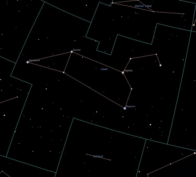 ![]() ![]() ![]() ![]() ( Leo, Leo )![]() Lange bevor die Menschen die Erde bevölkerten, führte der Göttervater Zeus erbitterte Kämpfe gegen die Kinder der Gaia (Erde), die Titanen. Nachdem Zeus die Titanen besiegt hatte, gebar Gaia das schreckliche Ungeheuer Typhon, welcher nach vielen Kämpfen letztendlich von Zeus in die Tiefen der Erde verbannt wurde. Typhon vermählte sich mit Echidna, einem Ungeheuer halb Frau halb Schlange. Eines Tages sandten sie einen riesigen Löwen in ein Gebirge nahe der Stadt Nemea. Der Löwe verwüstete alles um sich herum. Der Argiverkönig Eurystheus stellte zu eben dieser Zeit Herkules, dem Sohn des Zeus, zwölf für unlösbar gehaltene Aufgaben. Eine davon war es, den Löwen von Nemea zu töten. Herkules suchte das Gebirge bei Nemea auf und fand die Höhle der Untiers. Vor einen der zwei Ausgänge wälzte er einen riesigen Stein. Am anderen Ausgang lauerte Herkules mit seinem gespannten Bogen. Als der Löwe kam, wurde er von den Pfeilen des Herkules überschüttet. An seinem Fell prallten die Pfeile ohne Wirkung ab. Da stürzte Herkules auf das Tier zu und schlug ihn mit seiner Keule. Der Löwe taumelte, worauf Herkules ihn packte und erwürgte. Zeus verwandelte den besiegten Löwen in ein Sternbild, um alle Menschen an die Heldentaten seines Sohnes zu erinnern. M65; NGC3623; Spiralgalaxie; scheinbare Helligkeit: 9,2m; Entfernung: 32 Mio Lj; M66; NGC3627; Spiralgalaxie; scheinbare Helligkeit: 8,9m; Entfernung: 29 Mio Lj; M95; NGC3351; Balkenspiralgalaxie; scheinbare Helligkeit: 9,8m; Entfernung: 30 Mio Lj; M96; NGC3368; Balkenspiralgalaxie; scheinbare Helligkeit: 9,2m; Entfernung: 35 Mio Lj; M105; NGC3379; Eliptische Galaxie; scheinbare Helligkeit: 9,5m; Entfernung: 36 Mio Lj; NGC2903; Balkenspiralgalaxie; scheinbare Helligkeit: 8,8m; Entfernung: 21 Mio Lj; zurück |