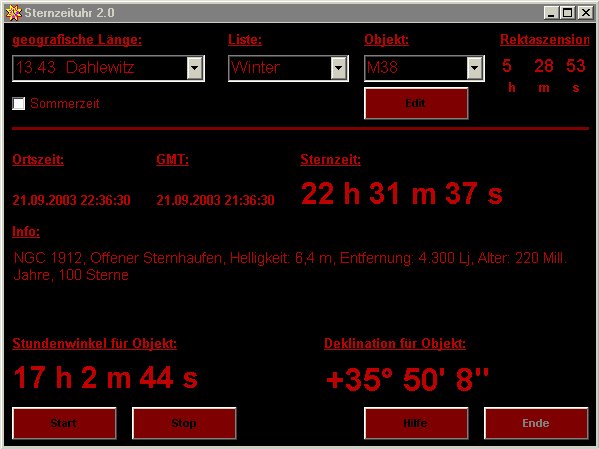 Dieses Programm wurde von Rene Isenberg und Michael Wenzel erstellt und dient der Bestimmung des Stundenwinkels von Objekten als Beobachtungshilfe. In version 2.1 wurde ein Berechnungsfehler, der zu fehlerhaften Sternzeitberechnungen für die