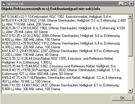 dazu 4 Listen mit jeweils den Messier-Objekten zur Verfügung, welche in der entsprechenden Jahreszeit gut zu